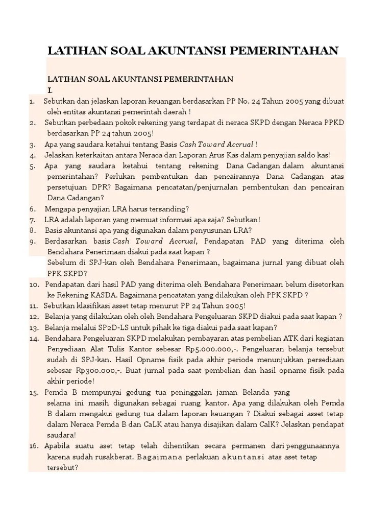 Contoh Soal Akuntansi Pemerintah - Soal Soal Akuntansi Pemerintah - contoh soal dan jawaban akuntansi pemerintah tentang laporan realisasi anggaran guru ilmu sosial contoh soal pilihan ganda laporan keuangan akuntansi dan jawabannya kumpulan contoh laporan.. 11142015 contoh soal anggaran penjualan perusahaan sampai pencapaian laba atau rugi oleh denny saputra. soal pilihan ganda akuntansi lembaga dan jawaban. contoh soal dan jawaban sistem administrasi keuangan negara i 8 11. contoh soal utang jangka panjang dan jangka pendek contoh soal terbaru Pasal 233 permendagri 13 / 2006 1.