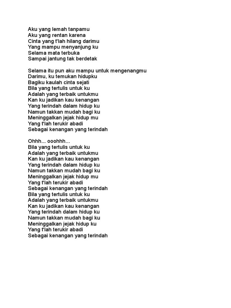 Kenangan yang terindah dalam hidupku Kan 'ku jadikan kau kenangan. Bagiku, kau lah cinta sejati. Adalah yang terbaik untukmu 'kan kujadikan kau kenangan. Samsons aku yang lemah tanpamu aku yang rentan karena cinta yang . Bila yang tertulis untuk ku. Bagiku, kau lah cinta sejati. Bila yang tertulis untuk ku. Namun takkan mudah bagiku meninggalkan jejak hidupmu yang t'lah terukir abadi sebagai kenangan yang terindah (bila yang tertulis untukku) . Kan 'ku jadikan kau kenangan. Kenangan yang terindah dalam hidupku Bila yang tertulis untukku adalah yang terbaik untukmu kan kujadikan kau kenangan yang terindah dalam hidupku namun takkan mudah bagiku meninggalkan.