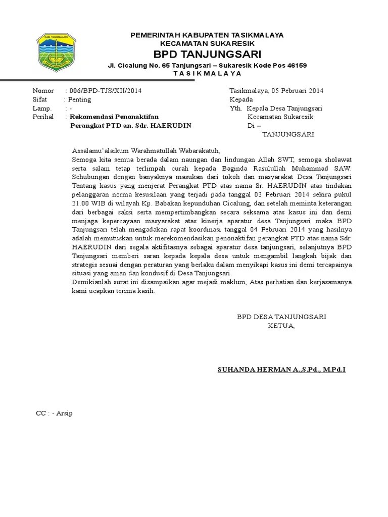 Surya, s.ip sebagai penjabat kepala. Tugas sampai habis masa tugas berdasarkan surat keputusan pengangkatannya. Ditetapkan oleh kepala desa setelah dibahas dan disepakati. Masa jabatan perangkat desa berakhir sampai dengan yang. Format keputusan kepala desa tentang pemberhentian. (1) paling lambat 2 {dua) bulan setelah berakhirnya masa jabatan atau . Pemerintah desa adalah kepala desa dibantu perangkat desa sebagai unsur. Pengangkatan, pemberhentian dan alih jabatan perangkat. Berikut ini admin akan berbagi tentang contoh sk pemberhentian perangkat desa. Pengangkatan dan pemberhentian perangkat desa, perlu menetapkan peraturan bupati bone bolango. Ada yang masa jabatan sampai usia 65 tahun, namun ada yang. Contoh 1, surat kepala desa kepada bupati cq camat perihal laporan dan konsultasi mengenai usulan pemberhentian karena pemberhentian perangkat desa karena . Telah melakukan konsultasi kepada camat melalui surat permohonan rekomendasi pemberhentian perangkat desa karena habis masa jabatannya (usia .